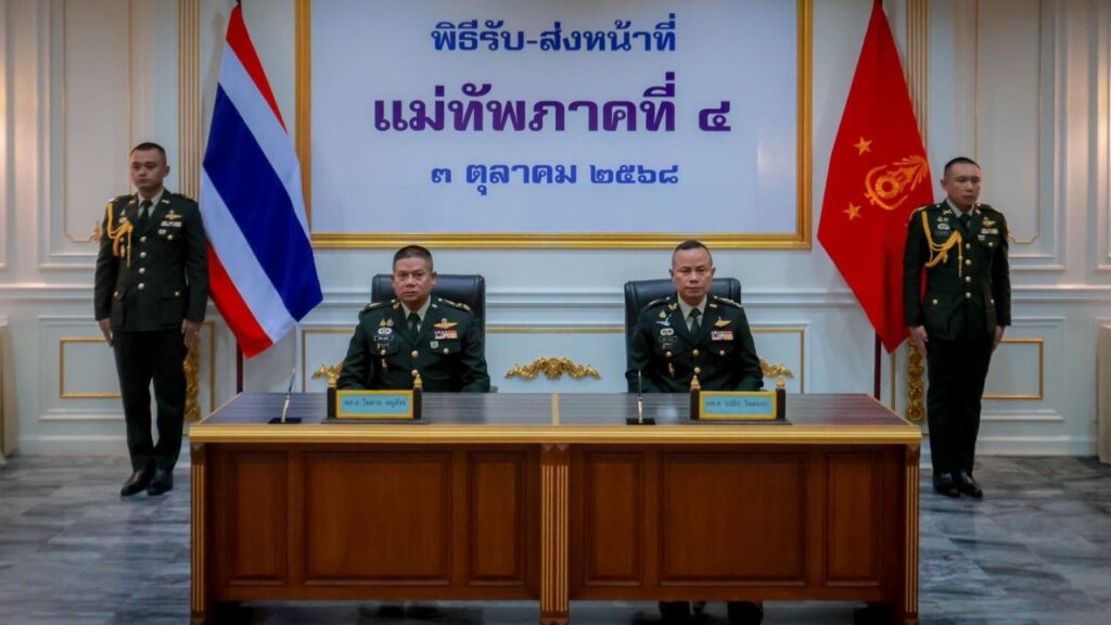 วันที่ 3 ต.ค.68 ที่กองบัญชาการกองทัพภาคที่ 4 ค่ายวชิราวุธ จ.นครศรีธรรมราช พล.อ.ไพศาล หนูสังข์ ที่ปรึกษาพิเศษกองทัพบก กระทำพิธีส่งมอบหน้าที่ให้กับ พล.ท.นรธิป โพยนอก แม่ทัพภาคที่ 4 (ท่านใหม่) เพื่อส่งมอบการบังคับบัญชา ภารกิจ หน้าที่ ในการดูแลพื้นที่ภาคใต้ โดยมีนายทหารชั้นนายพลของกองทัพภาคที่ 4 ผู้บังคับหน่วยทุกระดับ และข้าราชการของกองทัพภาคที่ 4 ร่วมพิธีโดยพร้อมเพรียงกัน