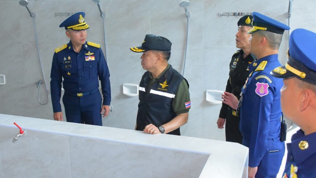 รมว.กลาโหม พร้อมคณะ ได้ตรวจเยี่ยมโรงนอน สถานีปฐมพยาบาล และจุดฝึกเคลื่อนย้ายผู้ป่วย ก่อนชมการฝึกท่ามือเปล่าของเหล่าทหารใหม่อย่างใกล้ชิด พร้อมพูดคุยให้กำลังใจและมอบสิ่งของบำรุงขวัญ